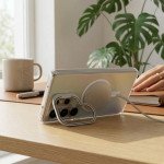 | Feature | Magnetic MagSafe-compatible hold, Metal kickstand for hands-free viewing, Camera lens protection frame, Internal shock-absorbing protection, Holographic gradient finish, Protective raised edges |