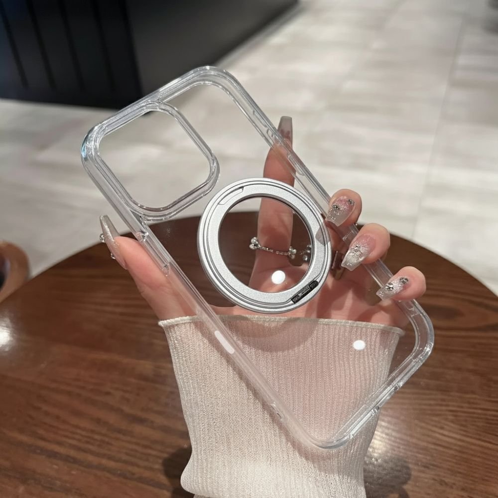 Description E Clear MagSafe Phone Case Rotating Magnetic Ring Kickstand Chrome Buttons Transparent
