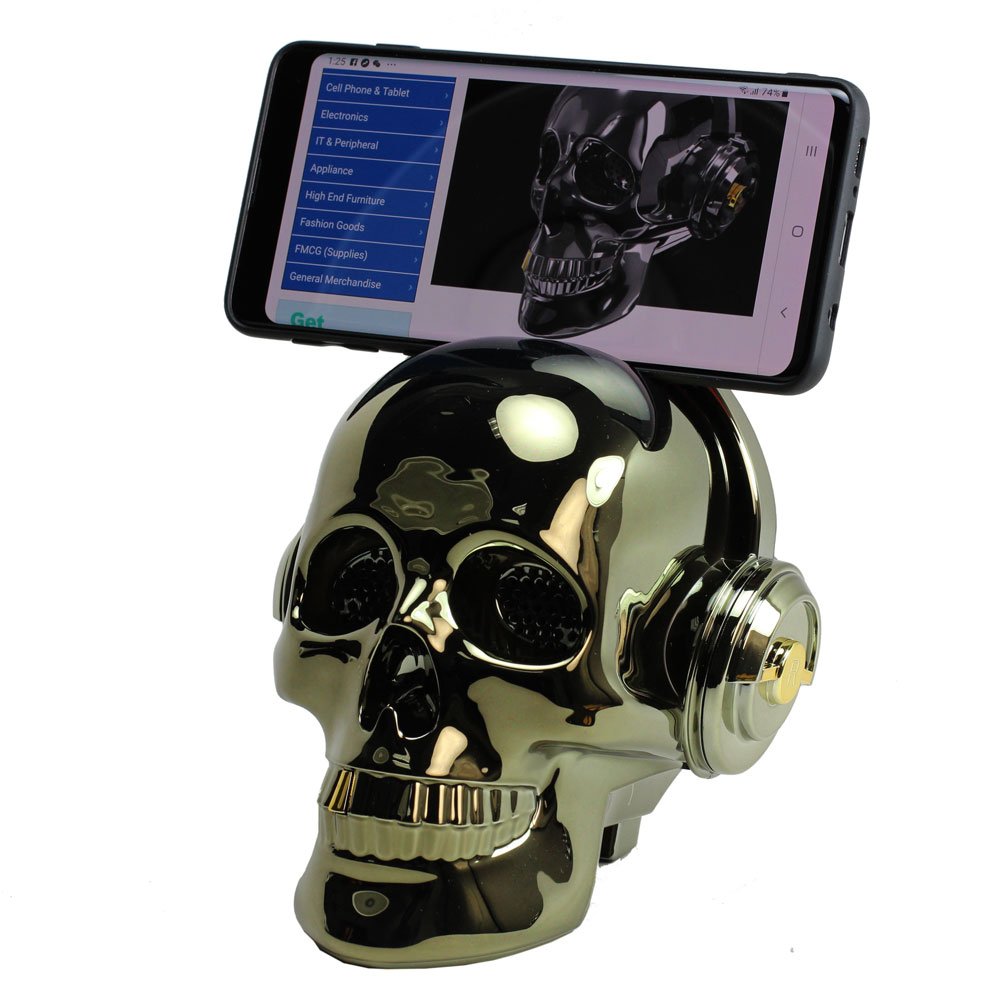 | WC Description | Golden Tooth Glossy Skull Skeleton Portable Bluetooth Speaker with Stand Feature (Black) |