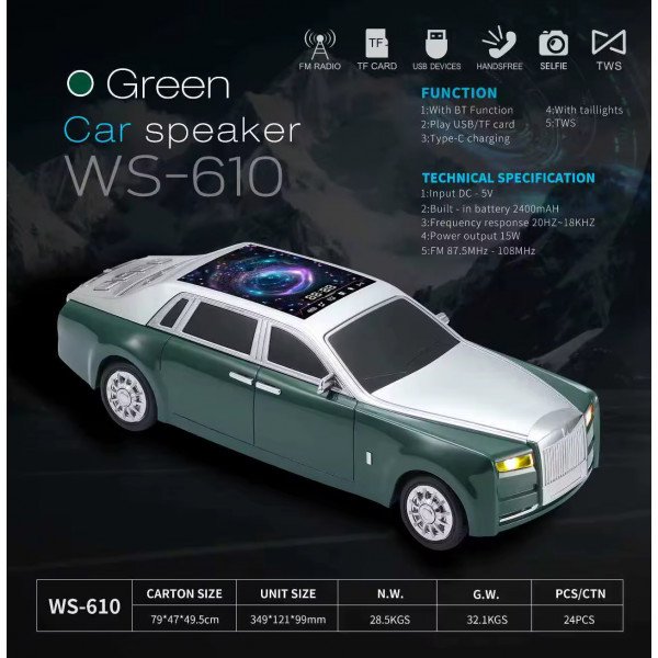 | Items Included (Accessories) | WS-610 Luxury Sedan Replica Bluetooth Speaker / Type-C charging cable (power cable) / Quick start guide |