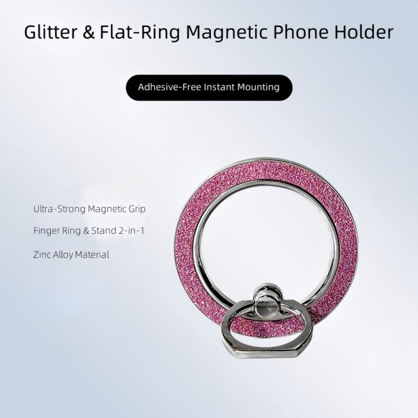| Feature | Glitter shiny finish, MagSafe magnetic attachment, 360° rotation, Foldable adjustable stand, Ring mount grip, Stick-on MagRing for non-MagSafe cases |