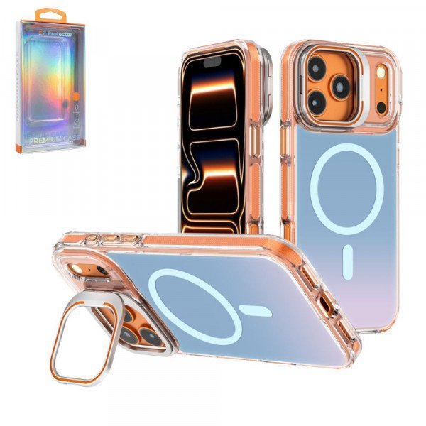 Holographic Gradient MagSafe Phone Case with Metal Kickstand & Shock-Absorbing Protection for Apple iPhone 17 Pro Max (Orange)